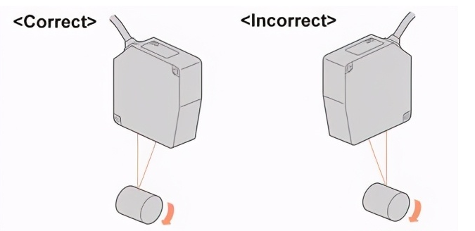 對反射很少光的黑色物體執(zhí)行位移測量時,分辨率會降低。這是因?yàn)樵诮邮詹糠譁p少了光量,并且從PSD接收的信號變小。在這種情況下,請如下圖所示安裝傳感器,以增加接收到的光量。