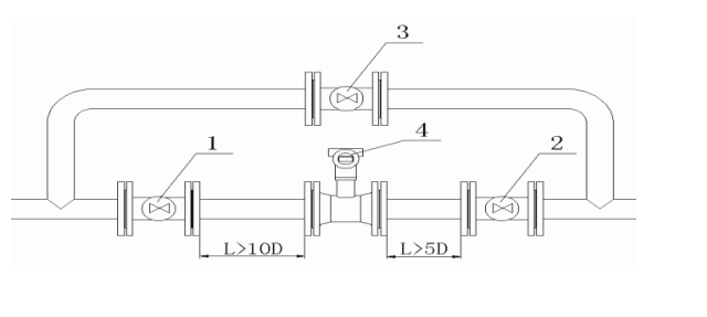 不允許直接在流量計(jì)測(cè)量管前后端安裝閥門、彎頭等極大改變流體流態(tài)的部件,如果需要在流量計(jì)前后管道上安裝閥門、彎頭等部件也應(yīng)盡量保證前后直管段長(zhǎng)度,直管段要求前10D,后5D,對(duì)于新完工的工藝管道,應(yīng)先進(jìn)行初步吹掃后再安裝流量計(jì)。