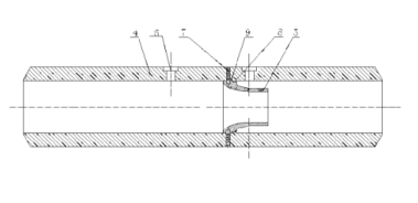 本實施例中的連接件7為銷子,當(dāng)然連接件7還可以為螺釘?shù)绕渌B接件。長徑噴嘴5裝配好后再鉆銷子孔(須配合銷子鉆),且銷子與長徑噴嘴要過盈配合,才能更好的保證長徑噴嘴與工藝管道的同軸度。