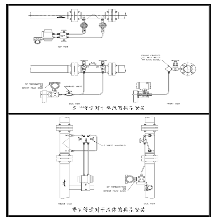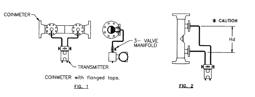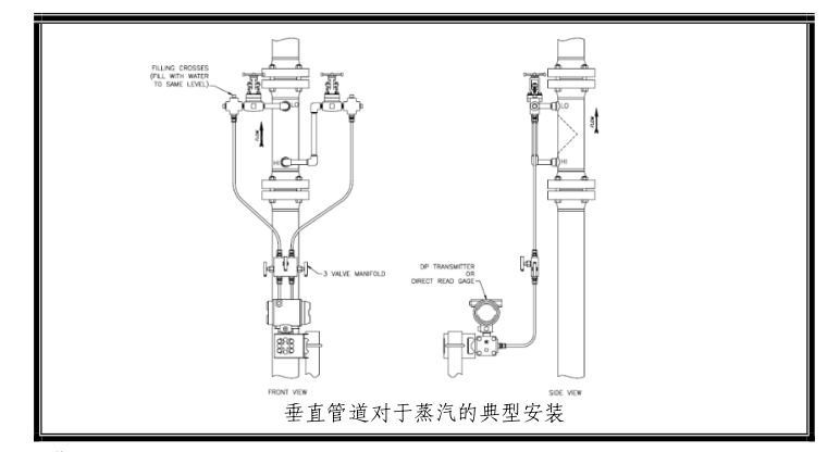 對于楔式流量計的垂直安裝方式,在變送器的調(diào)零過程中一定要考慮可能會產(chǎn)生的靜壓頭效果。楔式流量計與變送器之間的引壓管最小應(yīng)為3/8''管。(如FIG.2)變送器的調(diào)零過程中建議應(yīng)用三閥組。